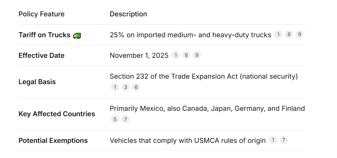 2.Scope and Impact: The 25% tariff applies to all imported medium- and heavy-duty trucks (generally those over 6 tons or 10,000 lbs) .